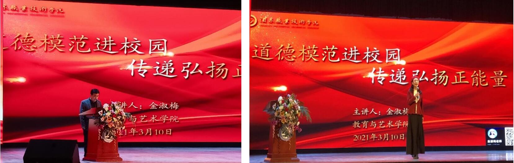 为大力宣传道德模范先进事迹,弘扬社会正气,进一步加强对道德模范、身边好人等先进典型的学习宣传,在学院营造“学模范、做模范”的氛围,3月10日,教育与艺术学院邀请全国学雷锋标兵、全国优秀志愿者金淑梅老师,为教育与艺术学院2020级700余名学生带来一场“道德模范进校园·传递弘扬正能量”的专题讲座。讲座由梁志红副院长主持。