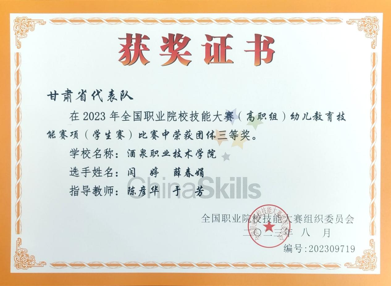 8月19日——8月22日,2023年全国职业院校技能大赛(高职组)幼儿教育技能赛项(学生赛)在金华职业技术学院举行,来自全国59所职业院校的118名优秀学子同台竞技。经过四天的激烈角逐,2020级学前教育专业闫婷、薛春娟组成的参赛队凭借扎实的专业功底与出色的技能展示荣获国赛三等奖。