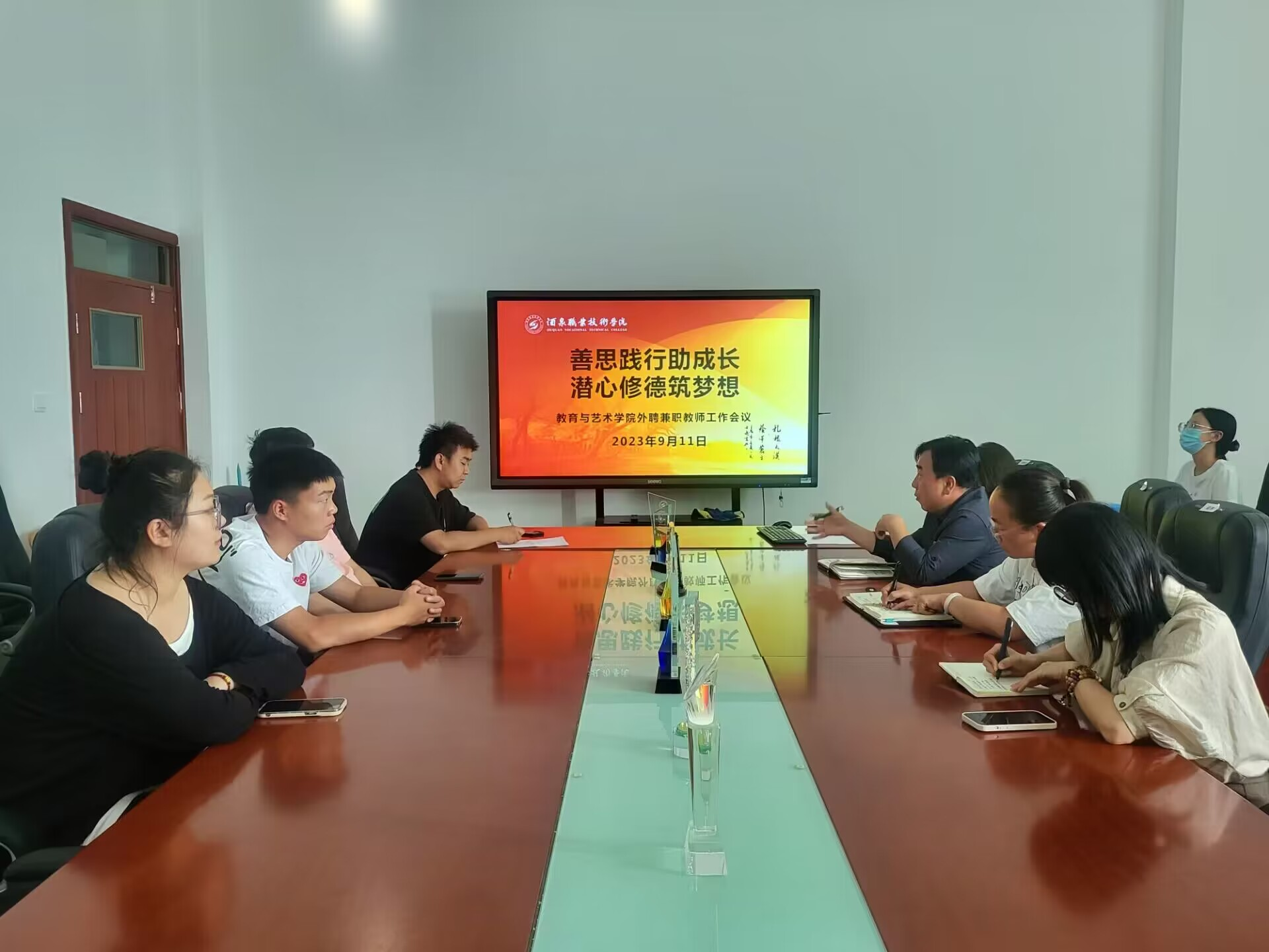 为进一步推进师德师风建设常态化,加强外聘(兼职)教师队伍建设和管理,确保新学期伊始教育教学稳步运行,9月11日下午,教育与艺术学院在行知楼704会议室召开了外聘(兼职)教师座谈交流会。会议通过统思想、明要求、话规范、立底线,推动外聘(兼职)教师作风教风转变和教育教学效果不断提升。