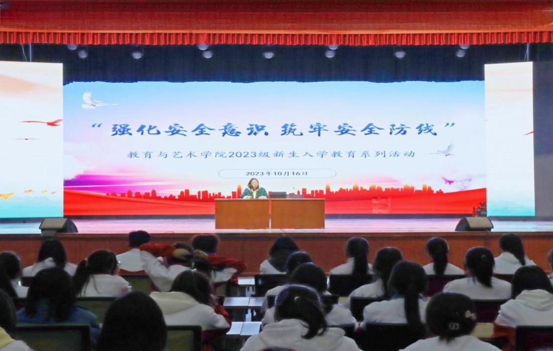 为切实加强学生安全教育,杜绝安全事故发生,提升学生的风险防范意识和避险能力,教育与艺术学院于10月16日在胡杨文化活动中心召开了“强化安全意识·筑牢安全防线”主题教育活动,此次活动为2023级新生入学教育系列活动之一,2023级全体学生参加了本次讲座。