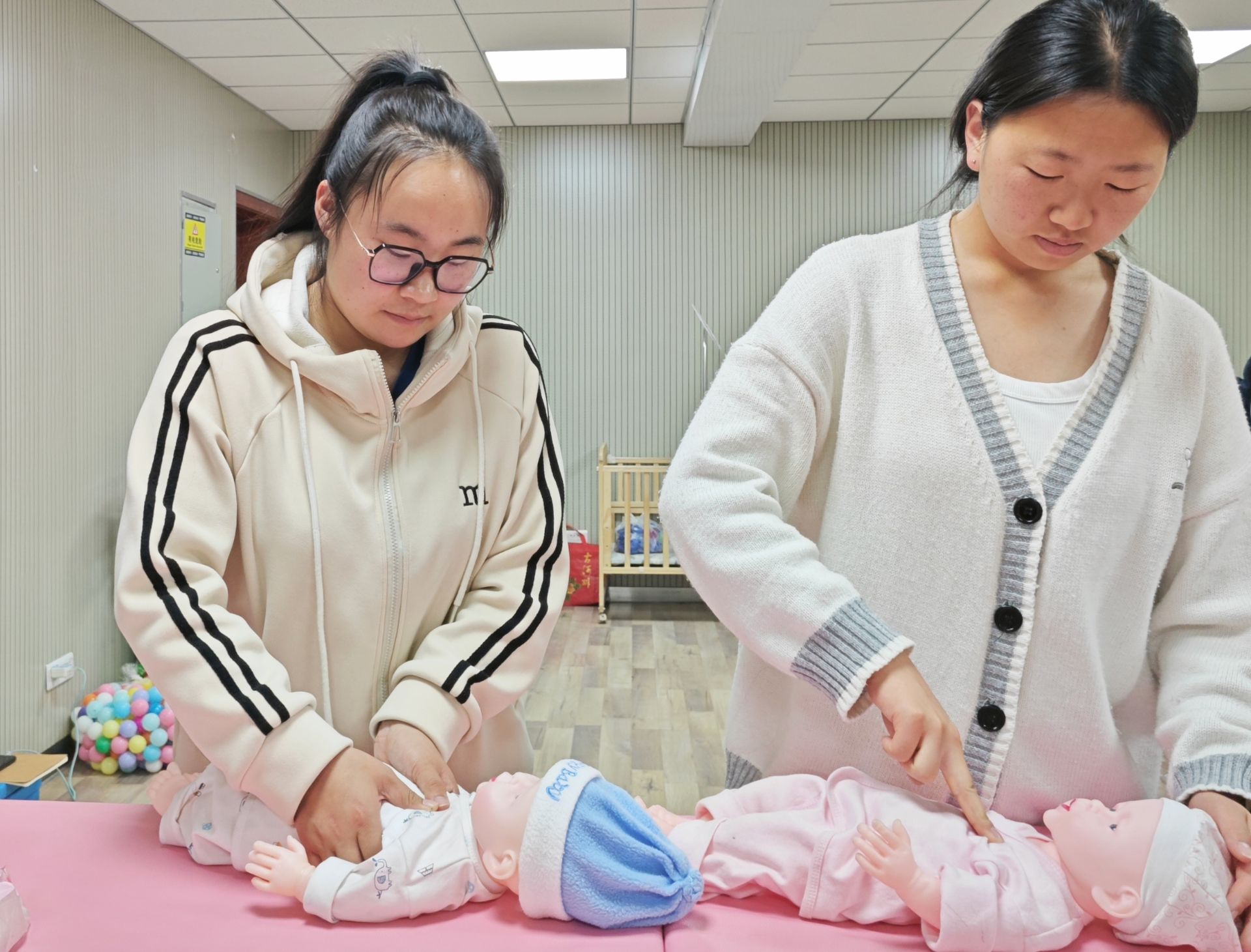 培训以“理论讲解+演示示范+实践操作”方式进行。理论讲解中两位老师围绕“育婴员职业道德规范、婴幼儿生理心理发展特点、婴幼儿日常保健、婴幼儿常见疾病处理”等内容进行全面系统的讲解,并结合育婴员评分标准,梳理考试模块,细化讲解内容,直击考试要点。