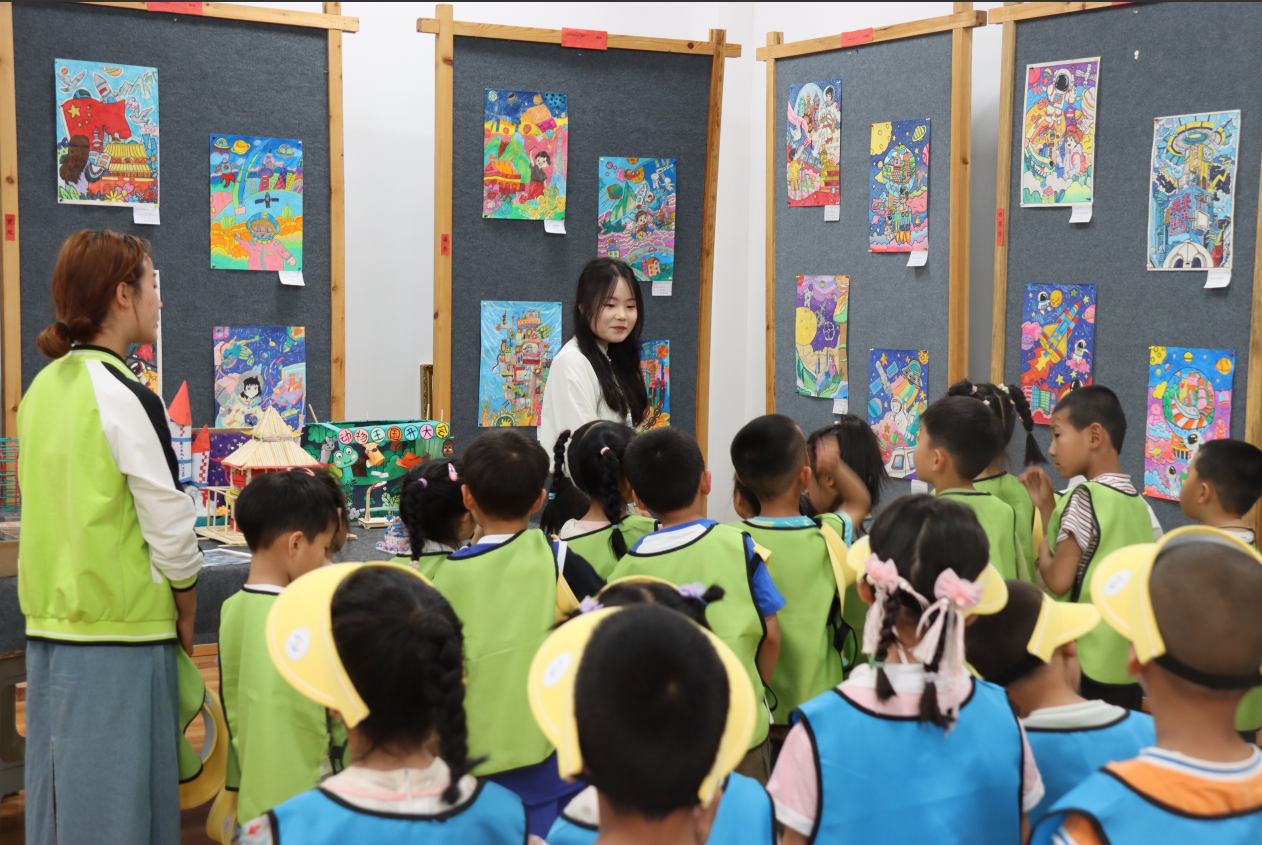 展览期间,酒泉职业技术学院附属幼儿园小朋友应邀参观了作品展,在教师的带领下近距离感受儿童画的艺术魅力,引导幼儿在观察中发现美、感受美,进一步激发小朋友对绘画的兴趣和创造力。
