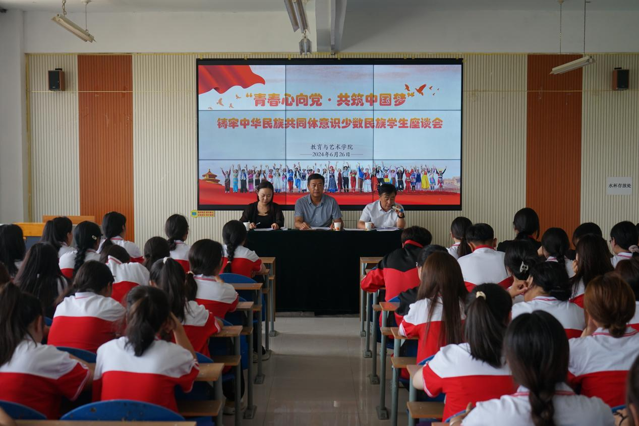 为深入学习贯彻习近平新时代中国特色社会主义思想和党的二十大精神,贯彻落实习近平总书记关于加强和改进民族工作的重要思想,进一步关心少数民族学生学习、生活情况,加强各民族学生间的交流,营造民族一家亲的良好育人氛围。6月26日下午,教育与艺术学院开展“青春心向党,共筑中国梦”铸牢中华民族共同体意识少数民族学生座谈会。教育与艺术学院领导班子参加座谈会,会议由学院团委书记贺雯主持。