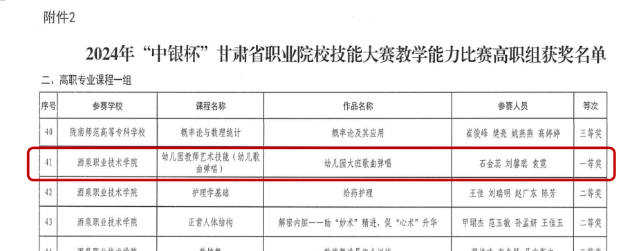 2024年“中银杯”甘肃省职业院校技能大赛教学能力比赛在兰州新区职教园区落下帷幕,经报名、作品审核、网络初评和现场决赛等环节的激烈角逐,教育与艺术学院石金蕊、刘馨聪、袁霓三位教师组成的“指尖舞芭蕾·唱响幼师情”教师团队荣获高职专业课程一组一等奖。