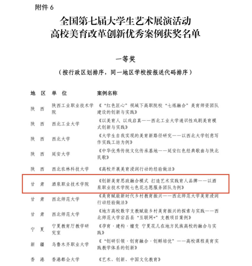 教育部办公厅关于公布《全国第七届大学生艺术展演活动高校美育改革创新优秀案例获奖名单》,教育与艺术学院七色花志愿服务团队的美育改革创新案例《创新美育思政融合模式打造艺术实践育人品牌——以酒泉职业技术学院七色花志愿服务团队为例》荣获一等奖。