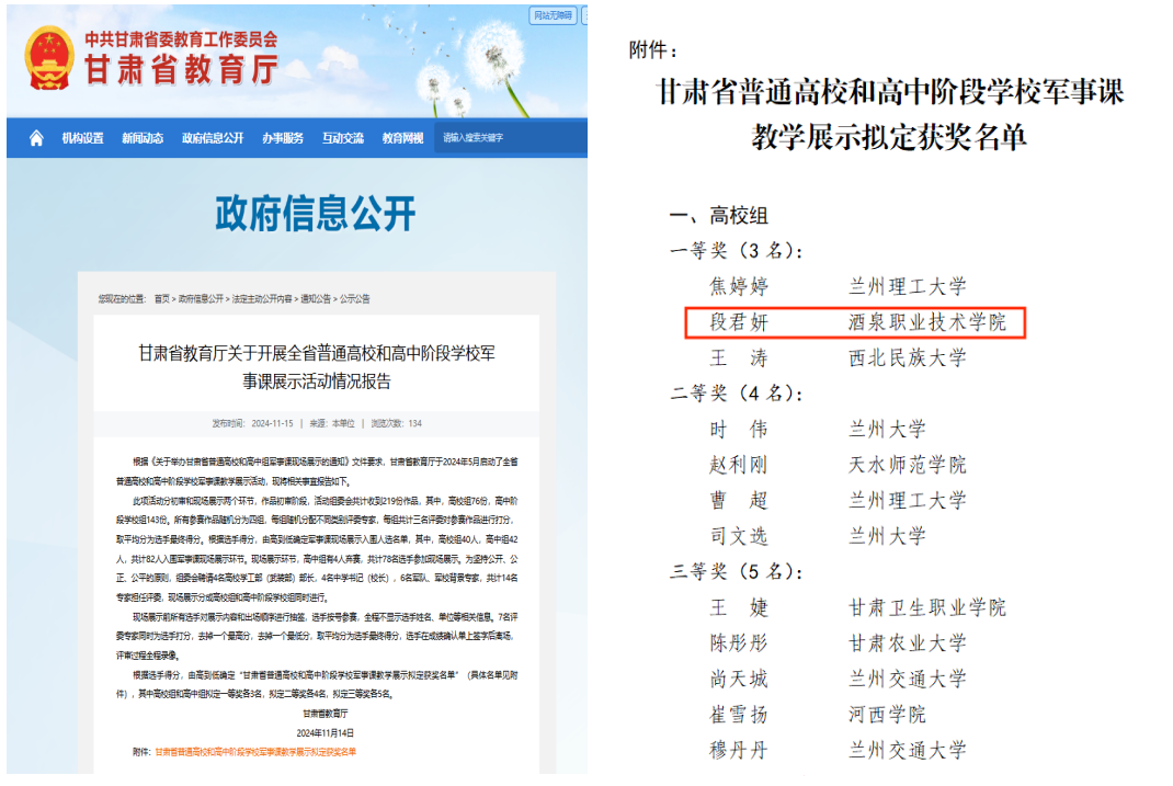 甘肃省普通高校和高中阶段学校军事课教学展示活动在兰州理工大学(兰工坪校区)落下帷幕,经学校初审上报、初赛作品评审和现场决赛等环节激烈角逐,教育与艺术学院段君妍老师“中国梦·强军梦”(信息化装备)军事课教学展示荣获高校组一等奖。