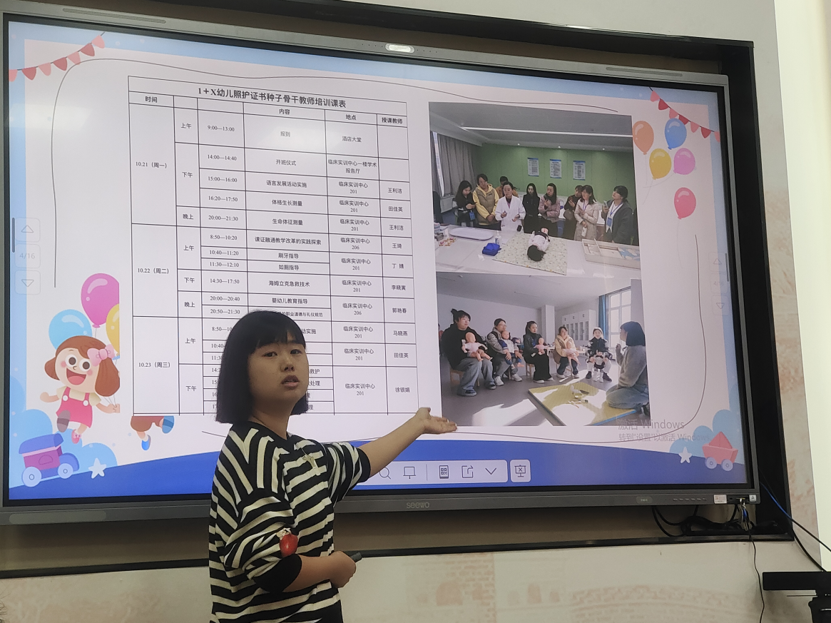 参培教师刘馨聪、张梦琪分别从“培训内容、学习成果、经验感悟”三个方面分别汇报培训成果,重点讲解了“婴幼儿教育指导前沿理论知识”“怎样进行精准、正确照护指导”“怎样创新教学方法数字赋能1+X幼儿照护培训”等内容,并以“幼儿刷牙指导”为例,从“环境-设施-物品准备-人员准备”四个环节进行现场实操展示。两位老师表示将以培训为契机,牢固树立科学职业教育理念、持续提升职业技能培训水平、积极培育高素质幼教人才。