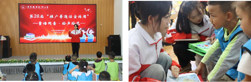 以志愿服务延伸推普工作的广度、传递温度,学院组织师生志愿服务队走进附属幼儿园,开展“童语同音・绘声绘色”推普绘本主题活动,通过标准讲述、情景互动等方式,点燃幼儿普通话学习热情,为语言启蒙教育注入专业力量。
