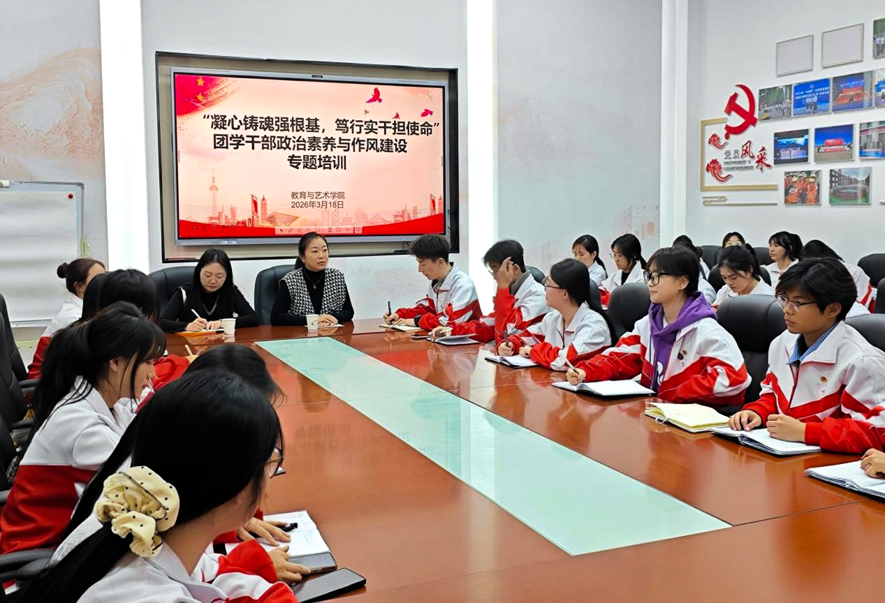 为进一步强化团学骨干队伍的政治素养与作风建设,提升工作效能与责任担当,切实筑牢团学工作的思想根基与组织根基,2026年3月18日,教育与艺术学院召开“凝心铸魂强根基,笃行实干担使命”团学干部政治素养与作风建设专题培训。会议由学院副院长段君妍主持,全体学生干部参会。